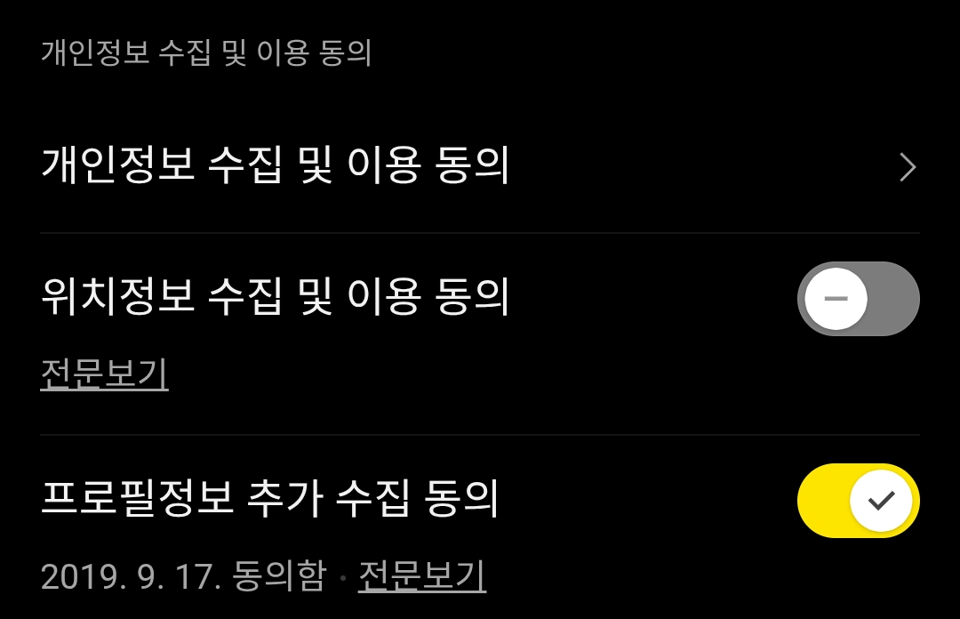 • 이용 동의한 서비스 목록을 확인할 수 있습니다. 여기서 '위치정보 수집 및 이용 동의' 항목을 찾아 노란색 버튼을 눌러 동의를 철회합니다.