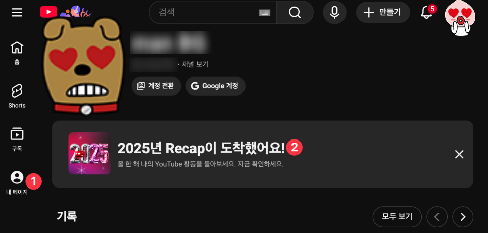 PC 환경에서도 유튜브 리캡을 확인할 수 있습니다. 모바일과 마찬가지로 유튜브 웹사이트에 로그인한 후, 좌측 메뉴에서 '내 페이지' 또는 프로필 아이콘을 클릭하여 동일한 배너를 찾을 수 있습니다. 배너를 클릭하면 PC 화면에서도 나의 2025년 연말 리캡 영상을 즐길 수 있습니다.